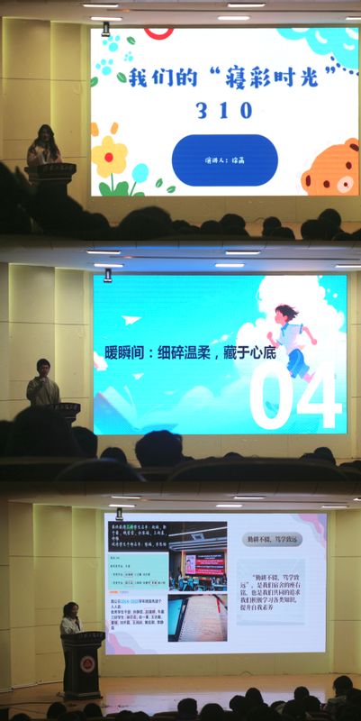 经过初选,9名选手依次登台,用真挚的语言讲述了各自宿舍的温馨故事与成长点滴:余诗彤讲述了六个性格各异的女生共同参加合唱比赛、制作宿舍门牌的经历;马传杰讲述了一个由“鸡架”展开的宿舍故事;人文学院徐菡展示了为彼此准备生日惊喜、运动赛场上的拼搏和参加朗诵比赛的精彩瞬间;机械与汽车工程学院余陈灏分享了从破冰聚餐的“社死”翻车现场,到军训场上组成五角星的团结时刻,再到一起制作“黑暗料理”的欢声笑语。这些日常片段展现了宿舍成员间深厚的情谊。