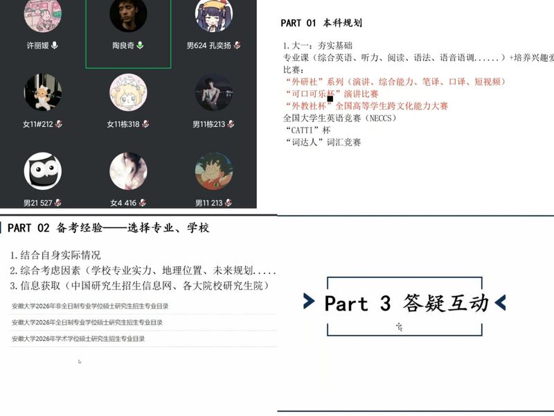 在最后的“答疑互动”环节,在线同学踊跃提问,问题涉及如何平衡学业与竞赛、考研心态调整、提高翻译实践方法等多个方面。陶良奇校友结合自身参赛与备考的丰富经历,逐一给予了细致、耐心的解答,其真诚的分享与鼓励赢得了同学们的连连点赞。