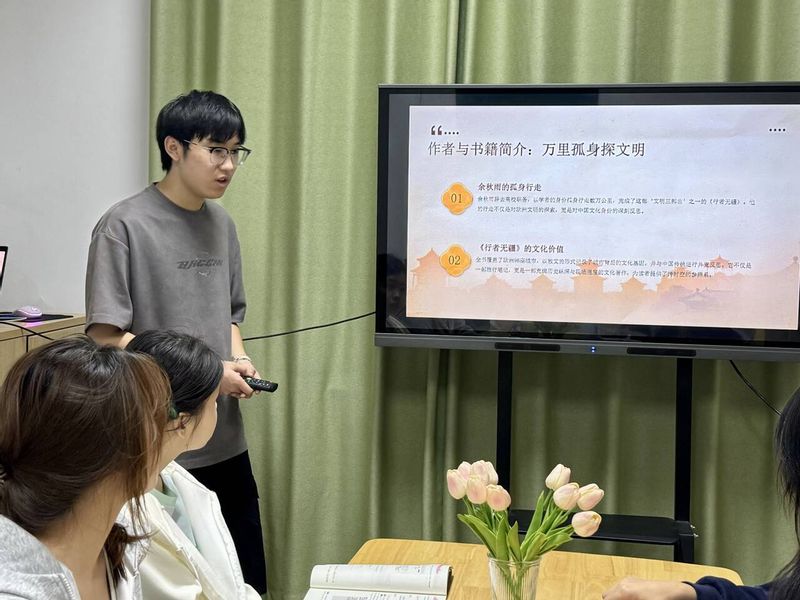 为深入推进学生社区文化建设,丰富学生精神文化生活,12月2日,数理与金融学院第七期“圆桌漫谈”读书分享会在女12栋评理说事大课堂举办。统计244班段永飞、区块链241班阮思彤分别围绕《行者无疆》《风流去》两部经典著作开展主题分享,学院2025级学生代表参与此次活动。 段永飞以“万里踪迹寻文明,一笔春秋话传承”为切入点,结合《行者无疆》主要内容,系统梳理了余秋雨先生遍历欧洲的行走历程,从“行走中的文化观察”“文字里的文明反思”两个维度,深刻解读了作品中对不同文明的审视与思考,引导在场学生感受跨地域文化的碰撞与融合。