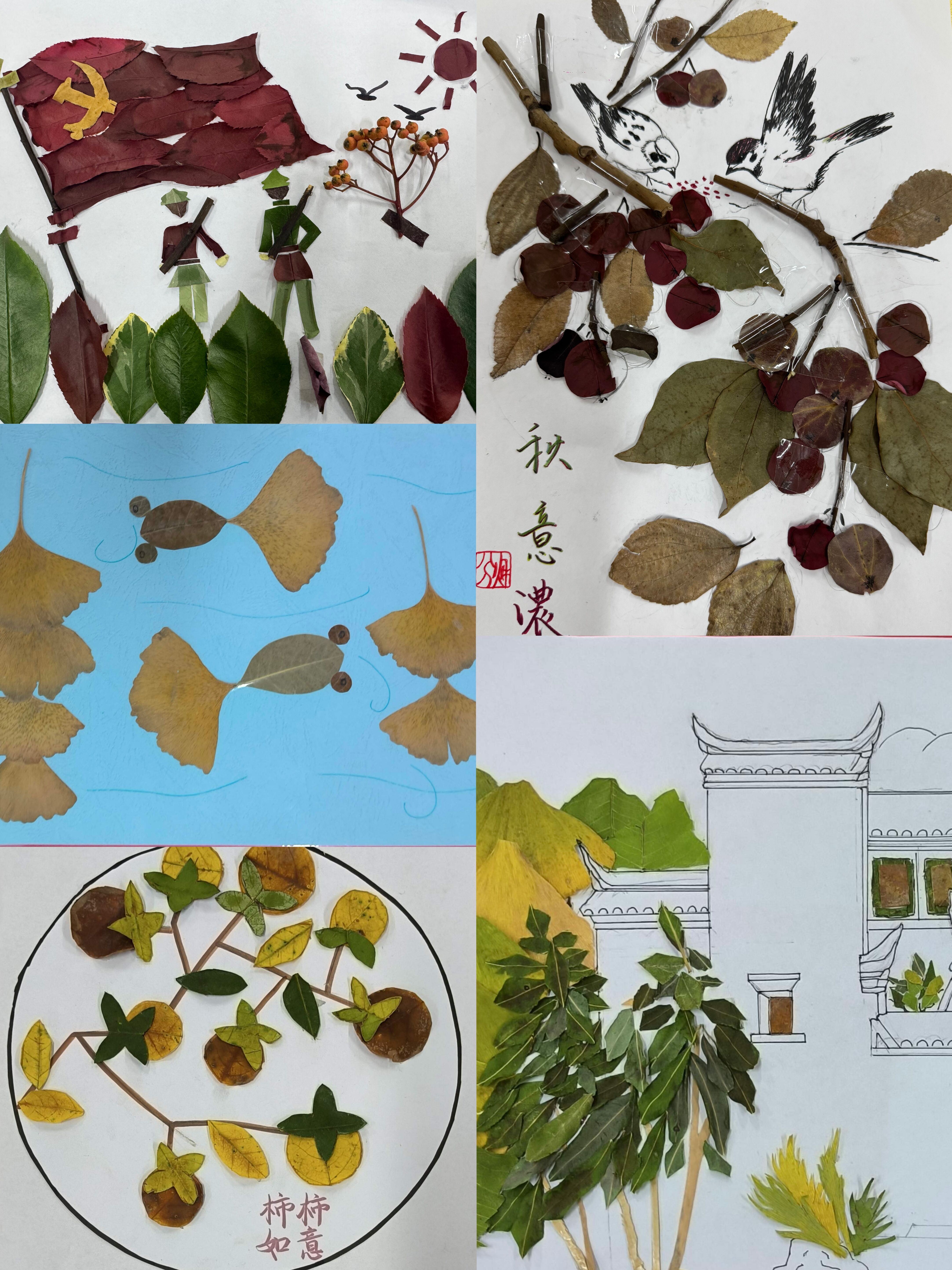 与此同时,“秋叶贴画” 活动以美悦心,为学生搭建了艺术疗愈的舞台。活动设置徽韵秋叶、金秋彩绘与红耀于秋三大赛道,100 余位同学利用课余时间收集多彩树叶,充分发挥想象力与创造力,将平凡秋叶转化为富有故事感和情感深度的艺术作品。在创作与交流中,学生们进一步提升了发现美、欣赏美、创造美的能力,实现了身心和谐发展。