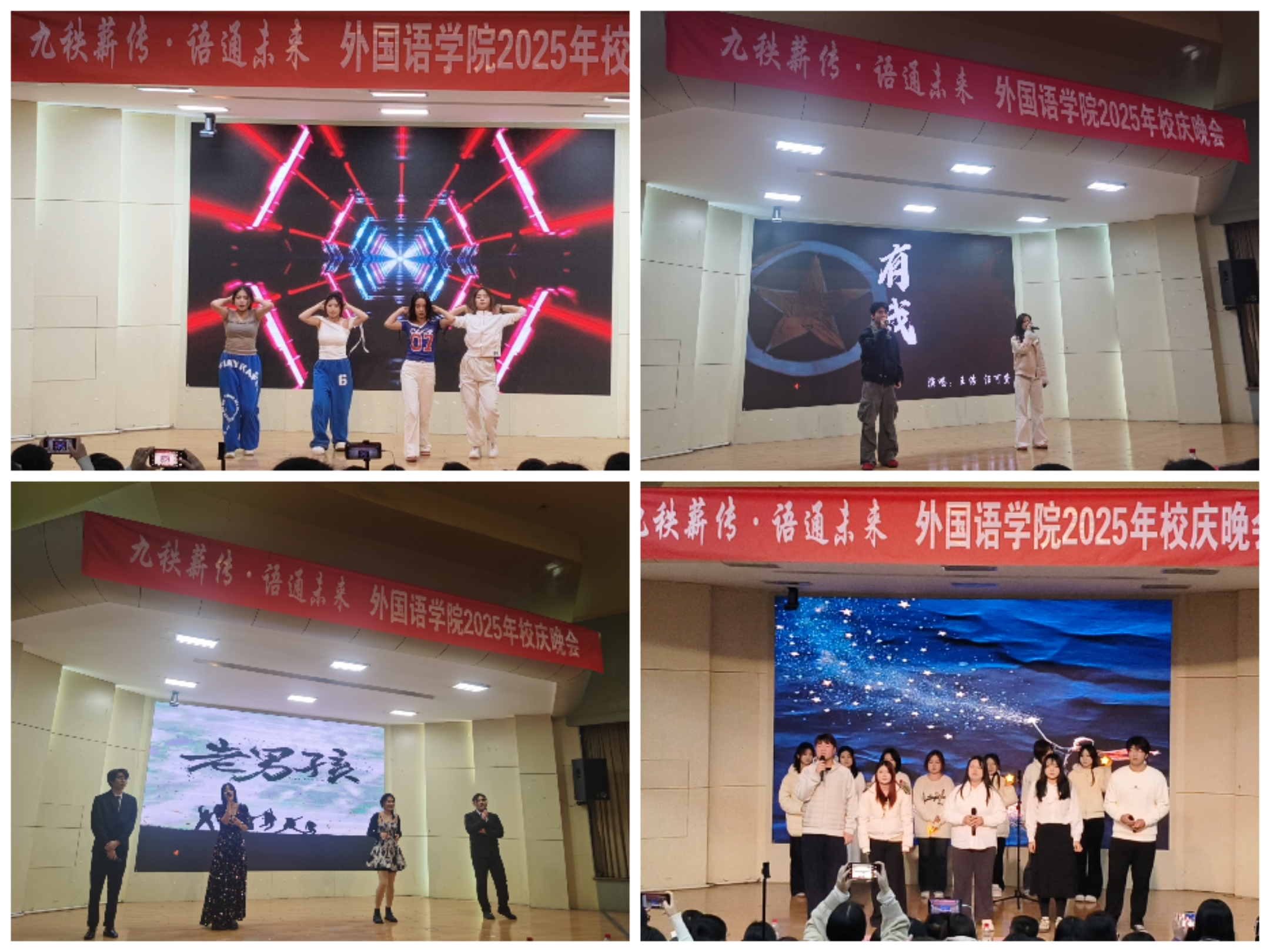 第三篇章“望·未来”将晚会推向高潮。大艺合唱团以一曲《有我》慷慨激昂,唱出了“强国有我”的青春誓言;朗诵《红的图腾》的表演者们用铿锵有力的语调抒发了外语学子胸怀家国、逐梦前行的深厚情怀;《舍得》《老男孩》等歌曲,唱出了成长路上的取舍智慧,更致敬了永不褪色的奋斗初心。最后,全体演员与在场师生起立齐声高唱《夜空中最亮的星》,歌声中饱含对母校的深情祝福,为晚会画上圆满句号。