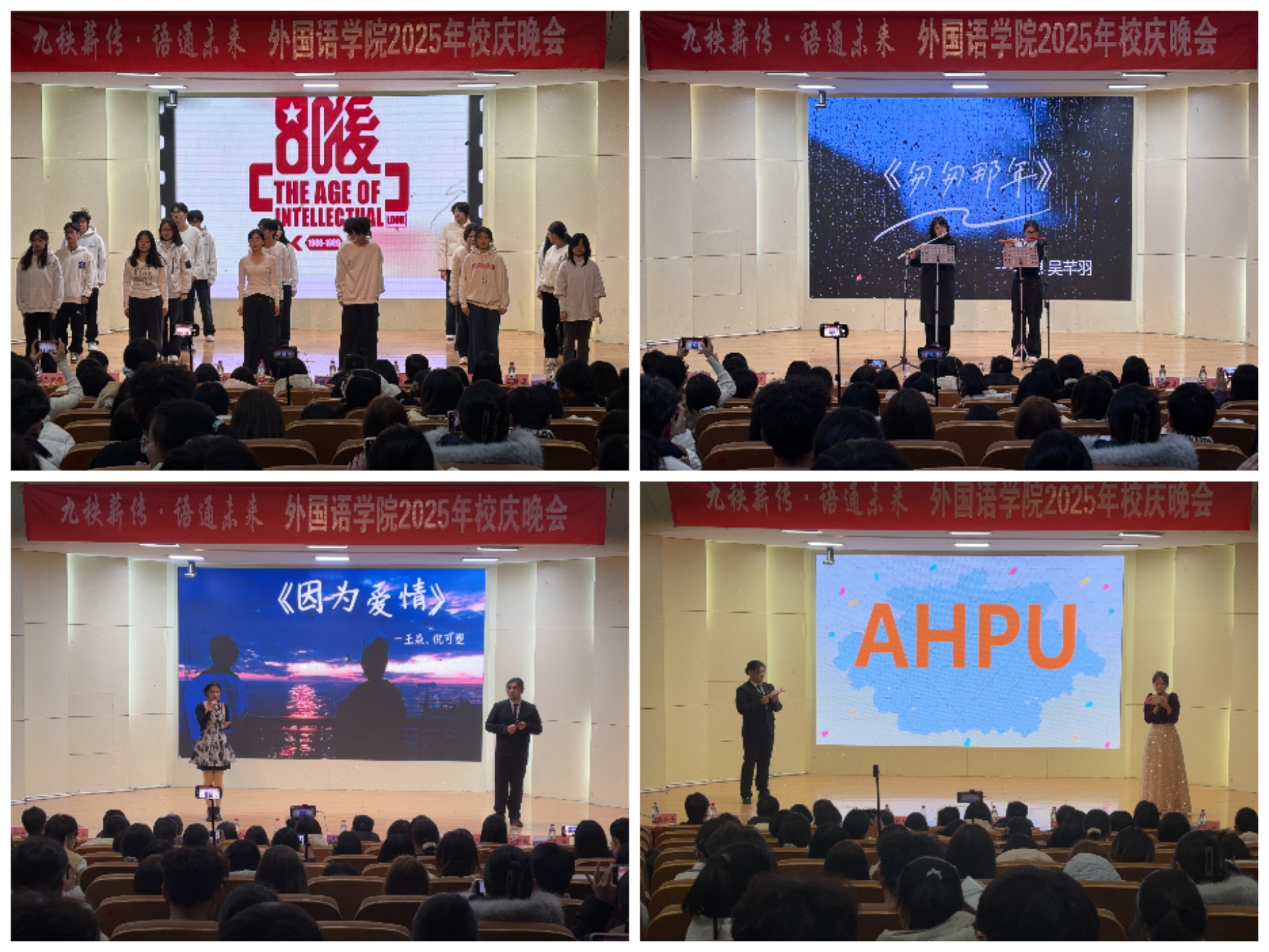 第一篇章“忆·往昔”以街舞协会活力四射的《梦回80》拉开帷幕,动感的舞姿瞬间将现场观众带回激情燃烧的岁月,点燃全场气氛。随后的器乐合奏《匆匆那年》,悠扬的旋律缓缓流淌,唤起在场师生对校园时光的温馨回忆;王焱等同学演唱了《因为爱情》《男孩》等歌曲,用深情唱腔诠释了青春岁月里的真挚情谊与成长感悟,引发台下阵阵共鸣。 晚会精心设计的“Word Puzzle”互动环节,巧妙融合校庆主题与外语专业特色,让现场气氛持续升温。观众踊跃参与词汇拼写,在“GRATEFUL(感恩)”“HARMONY(和谐)”“CREATE(创造)”“AHPU”等英文词汇的拼接中,既展现了外语素养,更传递了对母校的感恩之心、对校园和谐的向往之情以及对未来创新的追求之志。