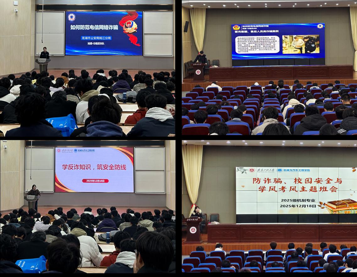 为庆祝学校九十华诞,落实“平安社区,献礼校庆”安全教育要求,12月18日,机械与汽车工程学院在二教报告厅和图书馆五楼报告厅举办反诈骗专题宣讲暨情景剧展演活动。活动特邀鸠江公安分局鸠盾·巾帼反诈队民警郭警官、城东新区派出所张警官主讲,反诈情景剧《爆裂无声》团队献演,以“专业宣讲+沉浸式体验”模式,助力学子认清诈骗套路、强化防诈意识、筑牢安全防线。 活动伊始,郭警官和张警官分别开展专业反诈骗宣讲。结合高校诈骗案例数据,用通俗语言拆解虚假购物、游戏账号交易、冒充客服退款、注销校园贷等常见诈骗类型的特征与变种,点出骗子利用大学生社会经验不足、贪图小利等心理作案的核心逻辑。传授“三不一多”防诈口诀(不轻信、不透露、不转账、多核实),详解反诈咨询渠道与被骗后应急处置流程,强调遇可疑情况需及时保存证据并拨打110报警。宣讲中互动问答环节氛围热烈,郭警官耐心解答学子防诈疑问。
