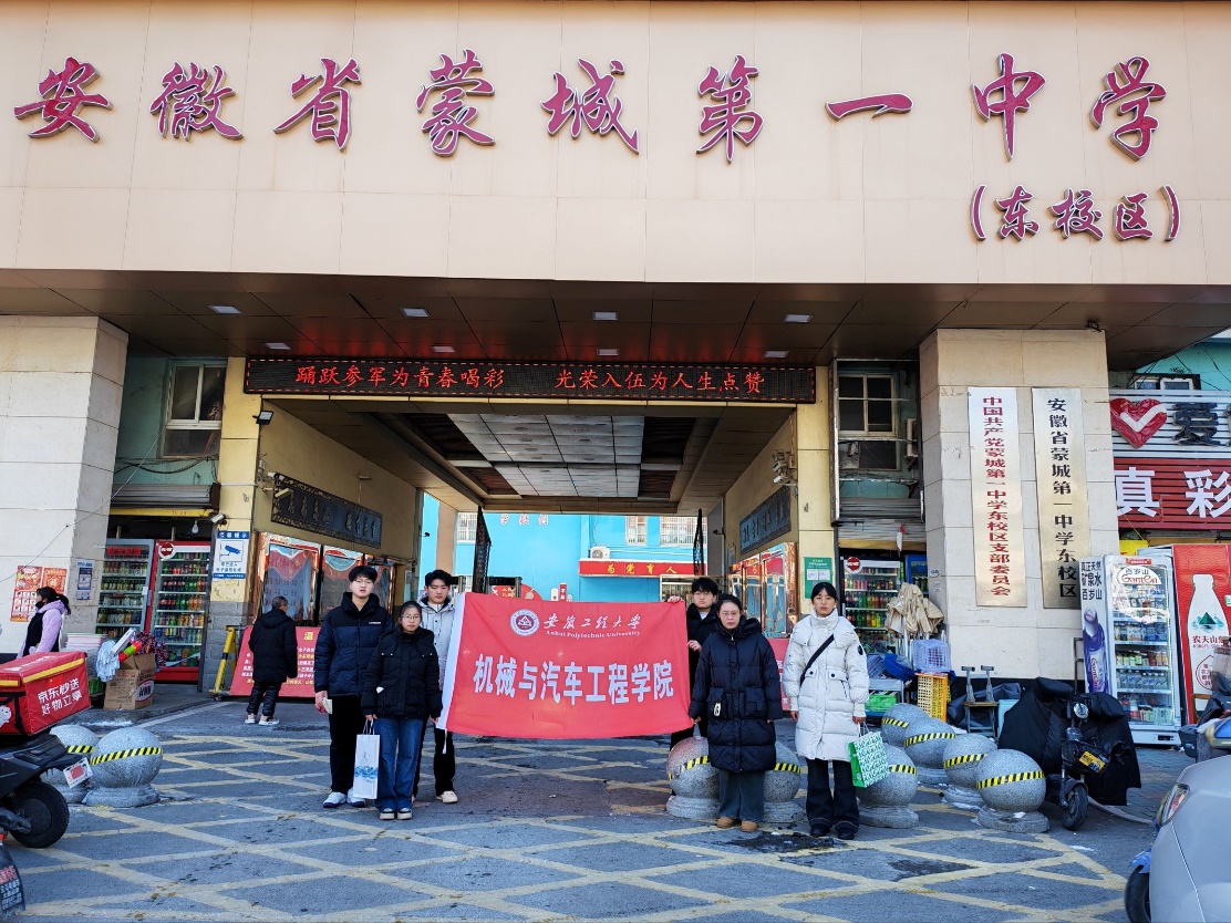 为帮助高中学子提前了解大学生活、明确学业规划,宣传安徽工程大学的办学特色与育人理念,1月22日,机械与汽车工程学院学生志愿服务队前往蒙城第一中学,开展“2026年寒假志愿服务暨回高中母校宣讲”主题活动。