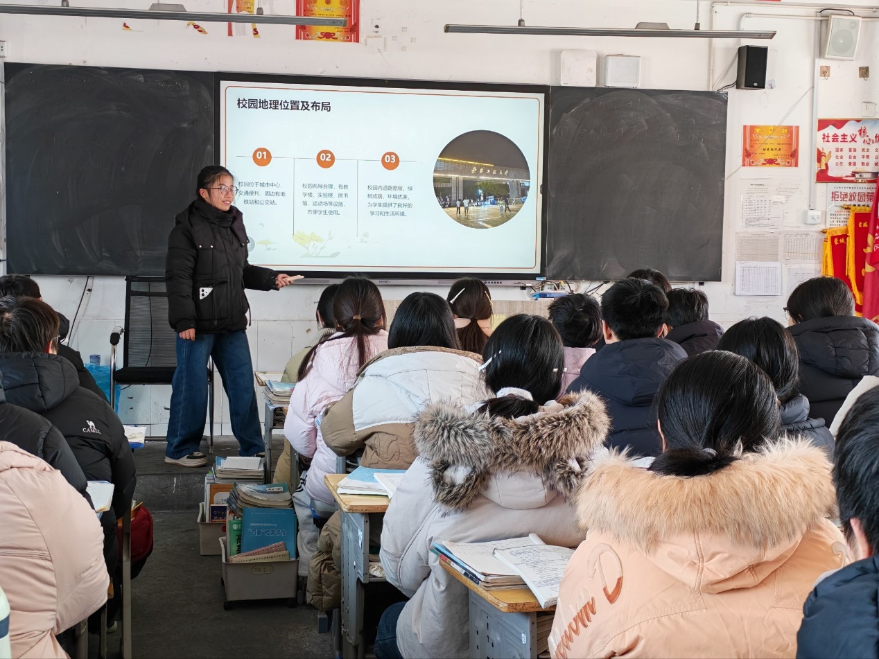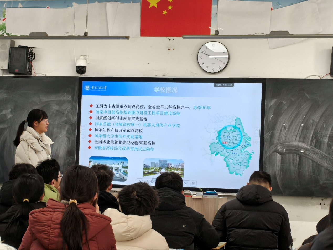 宣讲团队走进蒙城一中南校区与东校区的高一班级。队员们有序分发学校宣传册与文创纪念品,迅速拉近与同学们的距离。团队成员结合精心准备的演示材料,以自身在校的学习经历、生活体验与实践成长为切入点,系统介绍了安徽工程大学的学科特色、校园文化、招生政策以及丰富多彩的社团活动。在互动交流中,队员们围绕高中学习方法、大学专业选择、校园生活适应等问题,与在场学生展开深入交流,现场气氛轻松热烈。