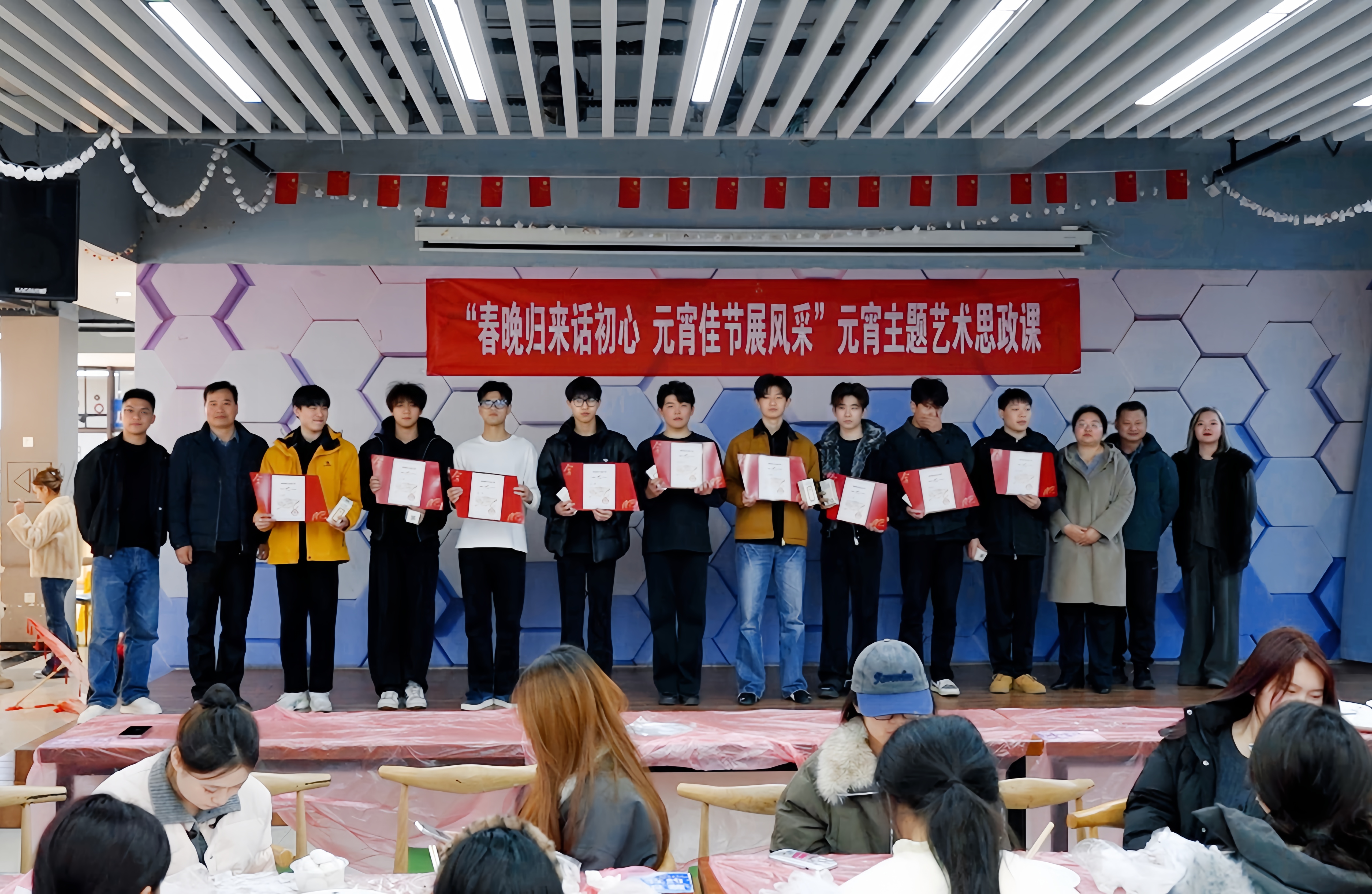 为弘扬中华优秀传统文化,发挥实践育人实效,3月3日下午,体育学院在学生社区第五食堂二楼艺术角举办“春晚归来话初心 元宵佳节展风采”主题艺术思政课。体育学院院长胡好、党总支副书记马晓琼、副院长金庆红出席活动,与参演央视春晚的学子及师生代表共度佳节。 活动在热烈的掌声中拉开帷幕。我院参加2026年央视春晚合肥分会场演出的9名学子重现了春晚中的精彩舞蹈片段。灵动的身姿配合着熟悉的旋律,瞬间将现场师生带回了那个万众瞩目的夜晚。随后,学院党政领导郑重地为每一位参演学子颁发了央视春晚参演证书及精美的纪念品,表彰他们历时42天的异乡坚守与辛勤付出。领导们勉励大家,要将“春晚精神”转化为刻苦训练的动力,把这次宝贵的经历当作人生中最生动的思政教材,不忘初心,继续在更大的舞台上为学院争光。