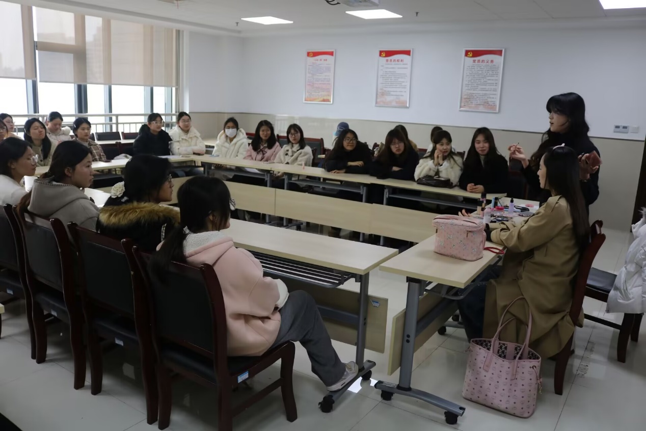 本次活动旨在通过专业的美妆指导,帮助女生们掌握实用美妆技能,不仅在外在形象上实现焕新,更在内在心理上增强自我认同与职业自信。活动邀请了彩妆形象指导老师进行现场授课,围绕当代大学生关注的日常通勤妆与职场职业妆两大板块展开。针对在校女生,强调在保留青春质感的同时,通过简单的技巧提升个人精神面貌。而在针对女毕业生的职场妆造环节,则重点演示了如何在面试或初入职场时,通过妆容传递出严谨认真的态度与自信大方的气质。