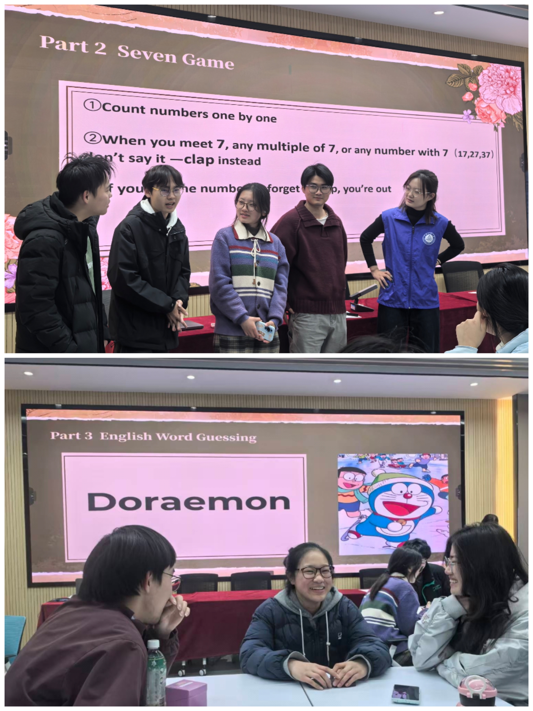 活动在轻松愉快的氛围中拉开序幕。为帮助中外学子迅速打破陌生感、融入交流环境,外国语学院“蒲公英”志愿服务团队的主持人首先带领大家开展了半小时的暖场互动,依次进行了“Name Chain”“Seven Game”及“English Word Guessing”三个环节。游戏过程中欢声笑语不断,掌声此起彼伏,同学们在互动中迅速拉近了彼此距离。尤其在“English Word Guessing”环节,中外学生混合分组,通过英语描述与协作猜词,既锻炼了语言表达能力,也增进了跨文化理解。