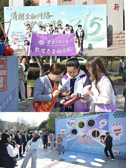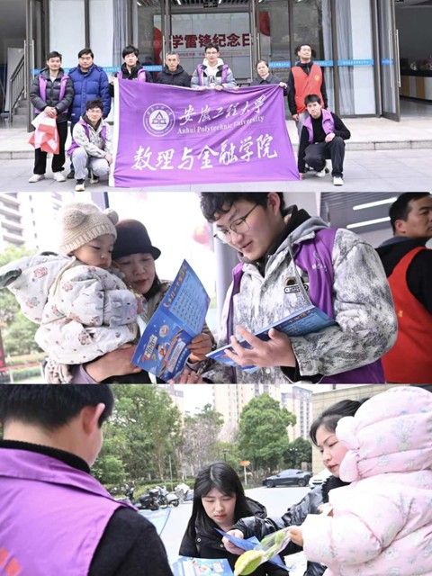 在第63个学雷锋纪念日及“3•15”消费者权益保护日到来之际,数理与金融学院青年学子在校园、社区、企业三大场景连续开展多场主题鲜明、形式创新的反诈宣传活动,以实际行动践行雷锋精神,为全民反诈注入青春动能。活动累计覆盖超3000人次,发放宣传资料1500余份,彰显了新时代青年的使命担当。 专业赋能,校园金融安全“活”起来 3月13日,学院学子协助共青团芜湖市委、招商银行等单位,在学校“一站式”学生社区青年广场开展“3•15”校园金融反诈宣传活动。依托专业学科优势,活动设立“金融安全咨询台”,一对一解答网贷陷阱、电信诈骗等咨询200余人次;推出“金融反诈闯关游园会”,将“风险识别大富翁”“消费陷阱迷宫”等游戏融入防诈知识,发放定制手册300余份。英语253班曹惠茹参与后表示:“活动让我坚定了拒绝‘校园贷’的决心,金融安全不是空谈,而是可操作的日常。”