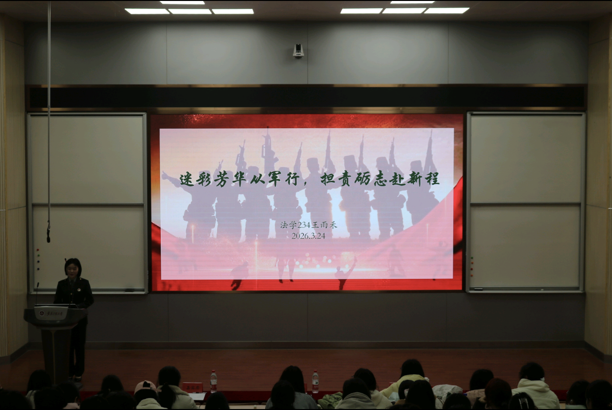 军旅砺志:以青春之名担时代使命 随后,退役大学生士兵代表王雨禾以“迷彩芳华映初心”为主题,分享自己的军旅成长故事。她以特战女兵经历为切入点,通过训练照片与感人瞬间,生动诠释了“军营给予青春”的深刻内涵。宣讲中,她以戍边英雄陈祥榕“清澈的爱,只为中国”的誓言,鼓励同学们以英雄为榜样,厚植家国情怀,积极响应国家号召,在绿色军营中书写无悔人生。