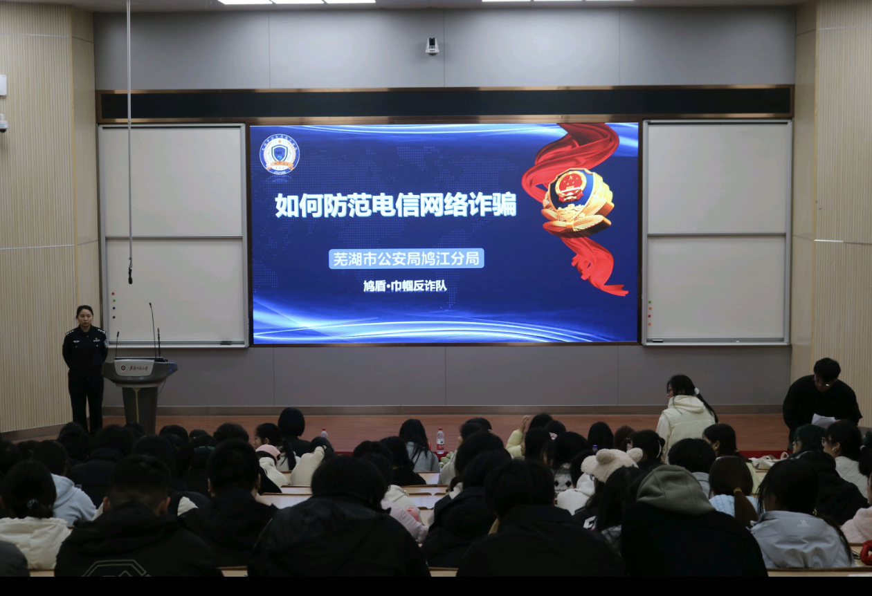 为筑牢校园安全防线,传递榜样奋进力量,2026年3月24日人文学院举办“青春护航,励志同行”主题宣讲活动。活动特邀芜湖市公安局鸠江分局“鸠盾·巾帼反诈队”民警黄嘉岭、退役大学生士兵及国家励志奖学金获奖学生代表担任主讲,学院全体2025级学生参加活动。 反诈护航:筑牢校园安全“防火墙” 活动伊始,黄嘉岭警官结合大学生日常场景,聚焦刷单返利、虚假投资理财、虚假网络贷款、冒充熟人/客服、AI换脸诈骗五大高发骗局,通过真实案例拆解诈骗套路,明确“刷单违法、垫付必骗、不泄信息”的反诈底线。针对易陷入的认知误区,现场传授实用技巧,专业的讲解与鲜活的案例让同学们深刻认识到电信网络诈骗的危害性,有效提升了大家的识诈、防诈、反诈意识。
