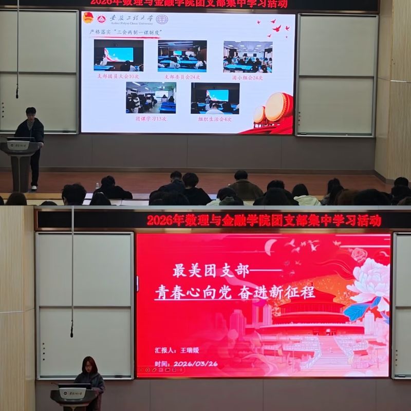 与会团员青年共同学习了习近平总书记关于树立和践行正确政绩观的重要论述,观看了警示教育片《错误政绩观之阳奉阴违搞变通》。校青年讲师团成员、金融251班王一情以“以青春之我,担时代之责”为主题,介绍了作为“家乡推荐官”开展寒假社会实践活动的情况,号召全体团员青年走出校园、走入社会,在传承传统文化、助力乡村振兴等工作中发挥青年智慧与力量。 学院18个团支部围绕思想引领与团支部规范化建设工作,汇报了落实“三会两制一课”、强化团员理论武装、增强支部凝聚力的具体举措,展现了不同的支部风采:金融232班罗艺静围绕支部特色品牌创建与集体凝聚力建设,讲述了支部打造特色活动、凝聚青年力量、助力学院发展的创新做法;统计254班李心如聚焦学风建设与实践服务,分享了支部组建学习互助小组、开展志愿服务、结合专业特色践行青春担当的鲜活案例;区块链241班秦紫悦围绕思想引领落地、组织规范运行、学风班风建设、实践服务成效、特色品牌打造五大核心内容,分享支部创建经验、工作亮点与成长感悟。
