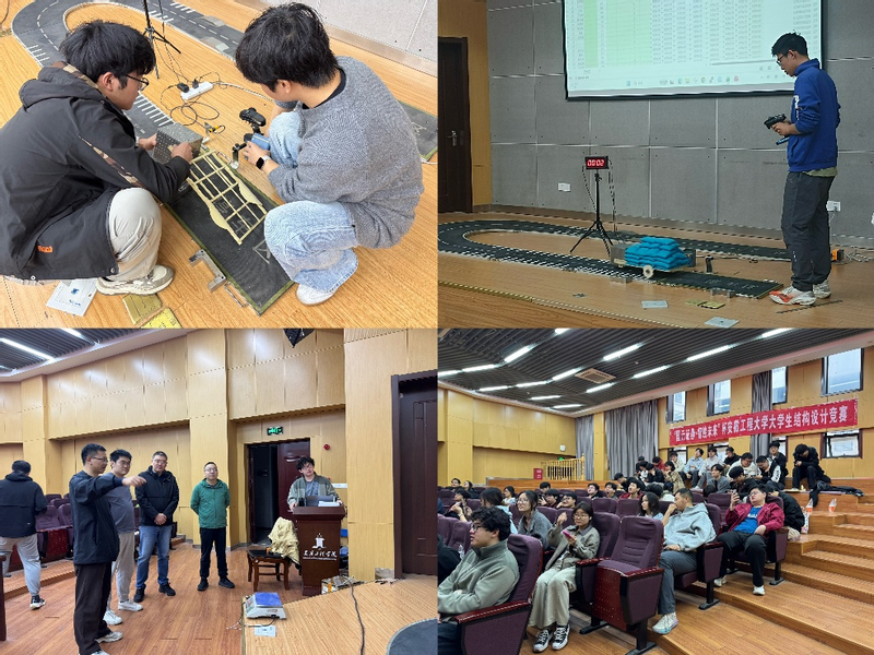 为激发大学生创新意识,提升工程实践能力,4月12日,“国元证券·智绘未来”杯第九届安徽工程大学大学生结构设计竞赛在C座三楼报告厅举行,学院党委书记张礼波、院长曾磊亲临现场指导。本次竞赛由安徽工程大学教务处主办,建筑工程学院承办,建筑协会与测量协会担任志愿者团队全程保障赛事有序开展。 本次竞赛以第十九届全国大学生结构设计竞赛赛题《勒勒车模型结构设计与制作》,融合国家级非物质文化遗产“勒勒车”的造物智慧与现代工程理念,要求参赛队设计制作一辆模型车。在动力小车牵引下完成坡道、弯道、减速带和单边桥等复杂赛道上的货物运输任务,全面考察学生的力学分析能力、优化设计能力及临场决策能力。自赛事启动以来,共吸引全校14个学院、30余个专业的120余名同学组成43支队伍参赛,规模较往年大幅增加。本届赛事得到了国元证券股份有限公司的冠名赞助和大力支持,为竞赛的高水平举办提供了坚实保障。 竞赛现场,参赛选手们专注投入、精心打磨模型,从车架设计到车轮组装,每一处细节都凝聚着巧思与匠心。在赛道运输环节,遥控动力小车牵引勒勒车模型平稳前行,顺利完成货物运输任务,赢得现场阵阵掌声。