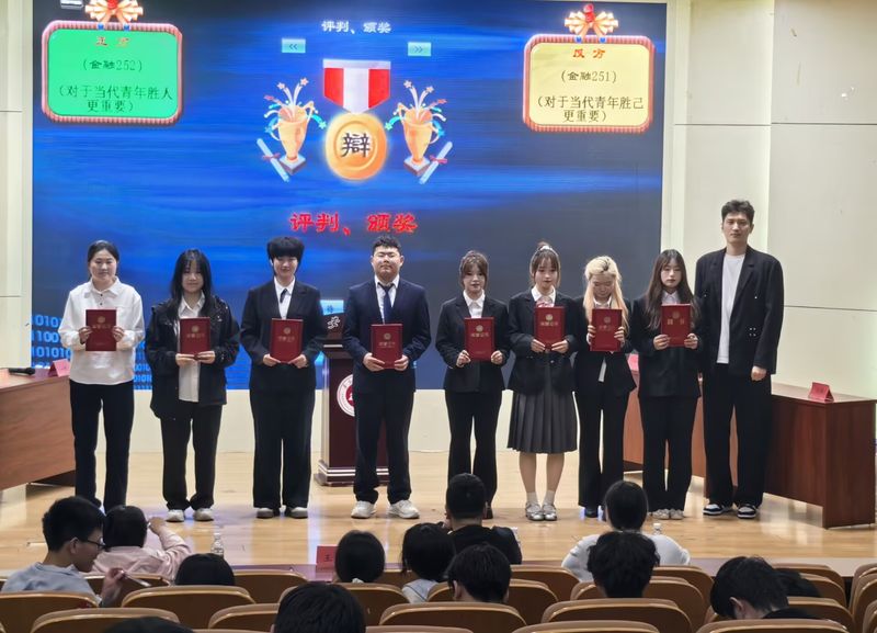 为丰富同学们课余文化生活,提高逻辑思维能力,4月10日晚,数理与金融学院在学术报告厅举办“以辩明理,以论求真”第十五届大学生辩论赛决赛。学校党委宣传部范夏勋、教务处王孟黎、互金231班杨贵婷担任评委,学生处副处长、学院学工负责人郭亚勤、学院团委副书记程安琪全程观摩比赛。 经过初赛、复赛的激烈角逐,最终四支队伍凭借出色的表现突出重围,成功晋级决赛。冠军争夺赛中,围绕“当代青年胜人与胜己孰更重要”辩题,正方金融252班从竞争驱动进步出发认为外部比较激发潜力,反方金融251班则立足自我超越强调内在成长才是根本;季军争夺赛中,围绕“人生应做加法还是减法”辩题,正方金融253班主张拓展经历、多元尝试是成长关键,反方则强调聚焦核心、简化生活更能实现自我价值。选手们结合现实语境,从个人成长到社会竞争多维度展开交锋,逻辑缜密、言辞有力,现场反响热烈。最终,金融252班夺得冠军,金融251班、金融253班分获亚季军,金融253班孙宏宜凭借出色发挥获“最佳辩手”称号。