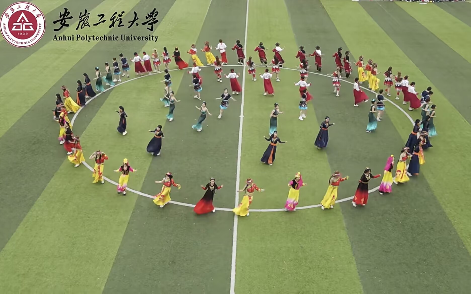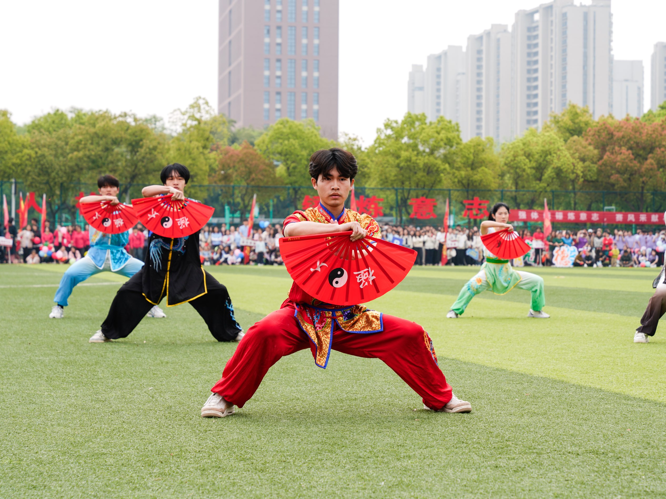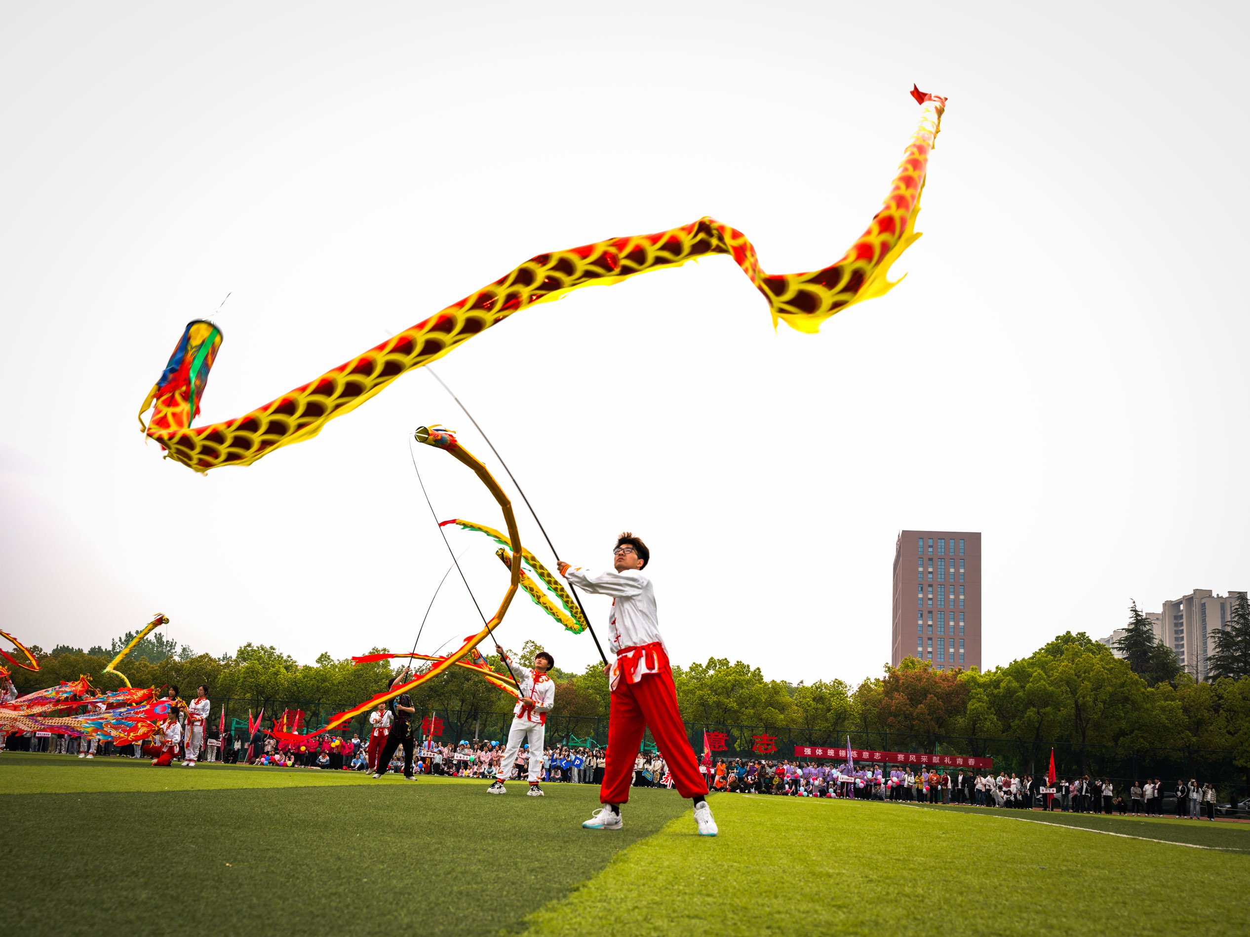 表演展风华:艺术与体育的完美交融 运动会开幕式上,体育学院带来的大型团体表演《徽程武韵》《爱我中华民族韵律操》《彩带龙、长杆龙》成为全场瞩目的高光时刻。伴随着激昂的音乐,体院学子身着统一服装,以整齐划一的队列变换开场,随后依次展示了武术民族舞蹈和舞龙等多个板块。刚劲有力的武术动作与柔美流畅的舞姿交相辉映,高难度的舞龙技巧与精准的队形衔接,赢得看台上掌声与欢呼声此起彼伏。整场表演将力量与美感、传统与现代有机融合,不仅展示了体育学院学生扎实的专业基本功,更传递出青春向阳、团结奋进的校园体育文化氛围。