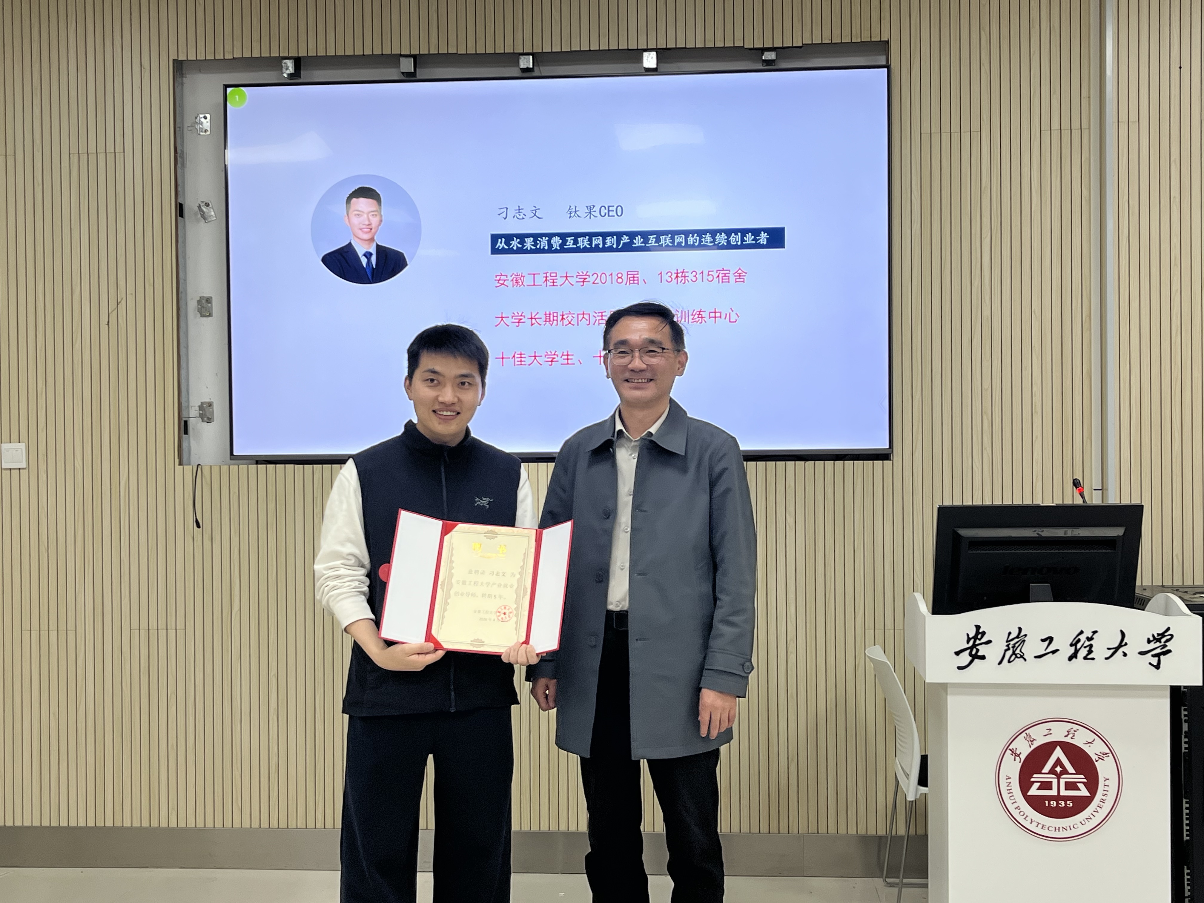 4月20日下午,由学生处主办、纺织服装学院承办的“优秀校友创业就业讲座”在一站式学生社区101室成功举行。本次讲座特邀纺织服装学院2018届优秀毕业生、南京钛果供应链信息技术服务有限公司CEO刁志文担任主讲嘉宾。学生处处长黄炜、纺织服装学院相关负责人及各学院学生代表到场聆听。 刁志文校友在校期间便展现出突出的创业才能,先后创立高校商店、“果鲜疯”等校园创业项目,荣获“安徽省十佳大学生”“安徽省创业之星”等多项荣誉。毕业后,他深耕供应链与信息技术领域,创办南京钛果供应链信息技术服务有限公司,专注于智慧供应链解决方案研发与落地,凭借创新模式与专业服务在行业内取得优异成绩。