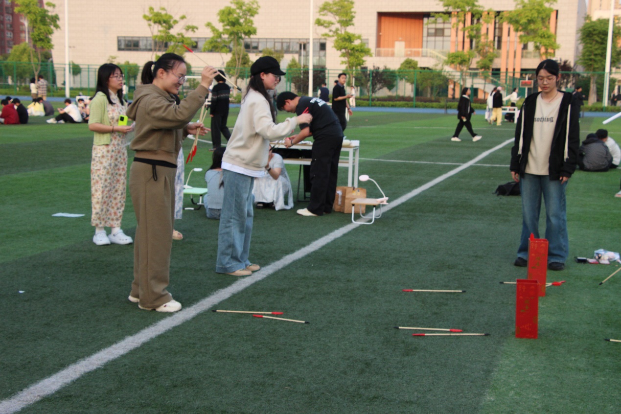 趣味互动,同心协力释放青春活力 从夜市区域走出,精心装扮的休闲区和游戏区便映入眼帘。足球门和操场围墙上星光点点的装饰分外夺目,欢乐有趣的游戏项目趣味纷呈。在工作人员的引导下,同学们积极参与“投壶”“拔河”“你画我猜”“接龙”等集趣味性与协作性于一体的挑战,掌声与欢笑声此起彼伏。大家在漫步中感受校园魅力,在游戏中体悟团结力量,在互动中收获美好情谊。