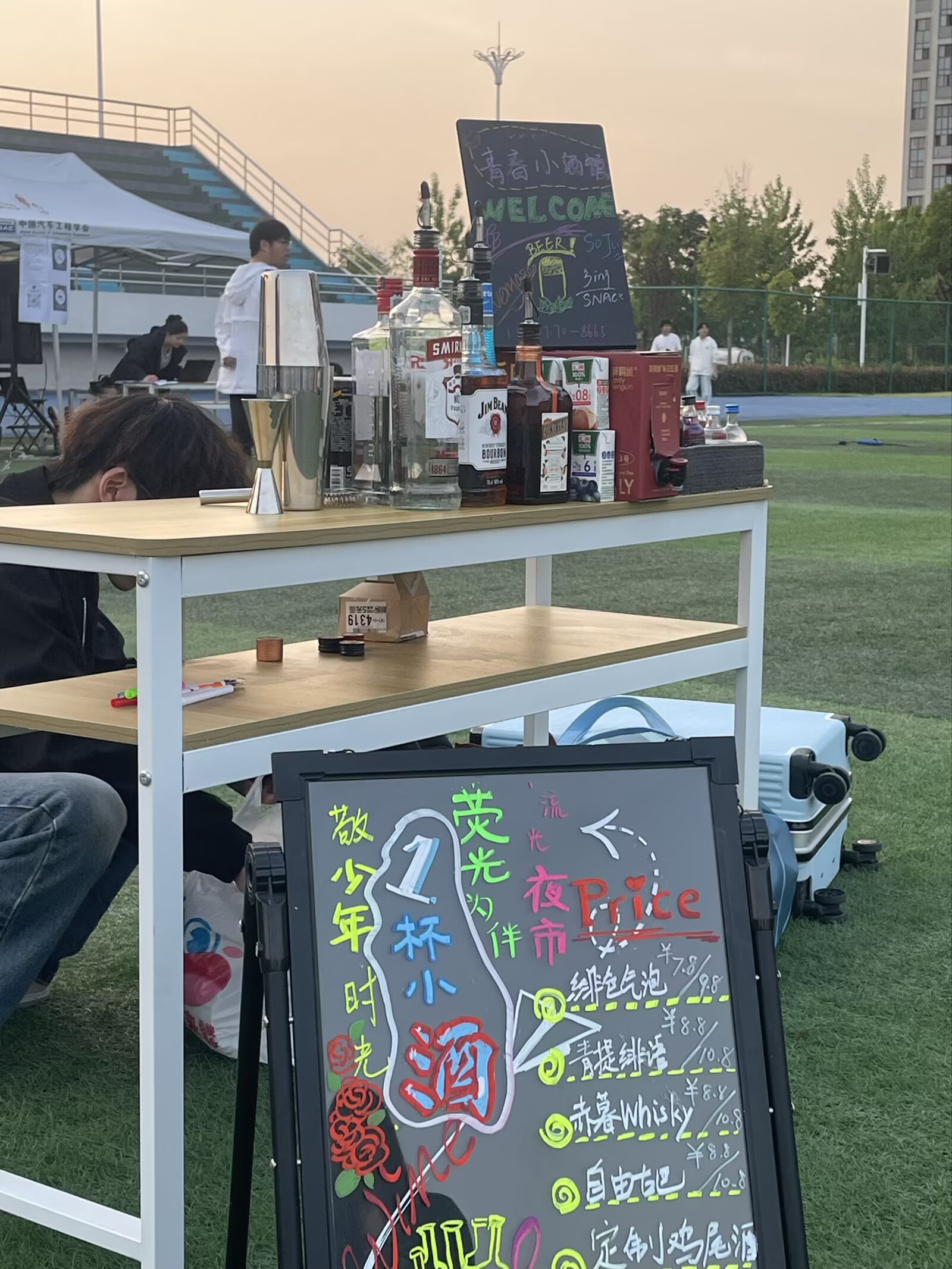 创意市集,巧思涌动点亮青春梦想 踏入夜市区域,五彩斑斓的荧光灯带与创意摊位交相辉映——这是属于安工程学子自己的“造物市集”。来自学院和学生社团的青年摊主们,将专业技能与兴趣爱好化为各具特色的手工创意。创意手绘、手作编织等文创摊前围满驻足观看的同学,果茶冰粉、自制甜点等食品摊位前排起长队,套圈、桌游等互动区更是欢声不断。摊位上琳琅满目、实用精巧的商品,不仅让同学们眼花缭乱,更彰显了安工程青年的巧思与干劲。