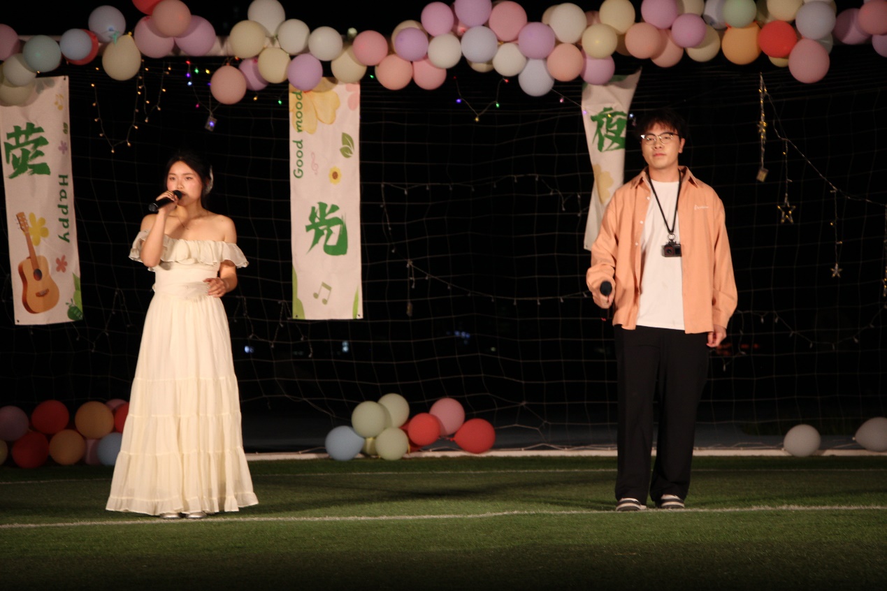 歌舞齐飞,乐章激昂唱响青春魅力 华灯初上,夜幕渐深,国际工程师学院的操场上却愈发热力全开。表演环节在激情洋溢的乐队演出中拉开帷幕,紧随其后的是校大学生艺术教育中心舞蹈团、爱乐社以及机械与汽车工程学院文艺团轮番登台献演,精彩不断的节目把现场气氛推向了一个又一个高潮。台上全情投入,台下热情应援。同学们手持荧光棒与手机灯,跟着节奏尽情挥舞,点点星光连成一片梦幻的“荧光海洋”。别具一格的中场互动环节更是点燃了全场笑点,掌声与尖叫不绝于耳,草地音乐节持续升温,青春与艺术在这一刻完美共鸣。